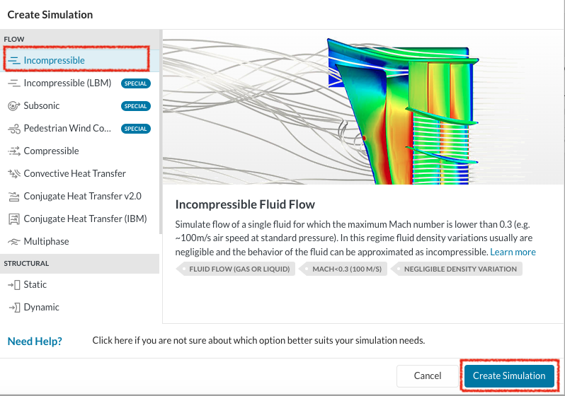 • Select ‘Incompressible’ and click Create Simulation